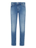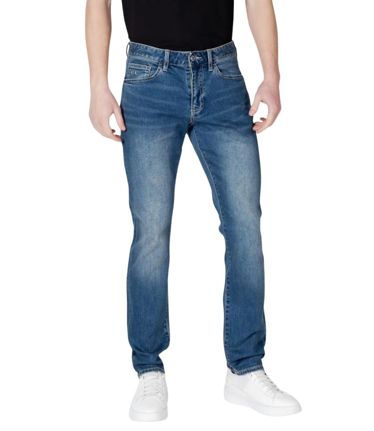 Jeans Armani Exchange vestibilità slim fit uomo, bottone e zip, cotone blu denim slavato, modello 5 tasche. Composizione: 98% cotone, 2% elastan.