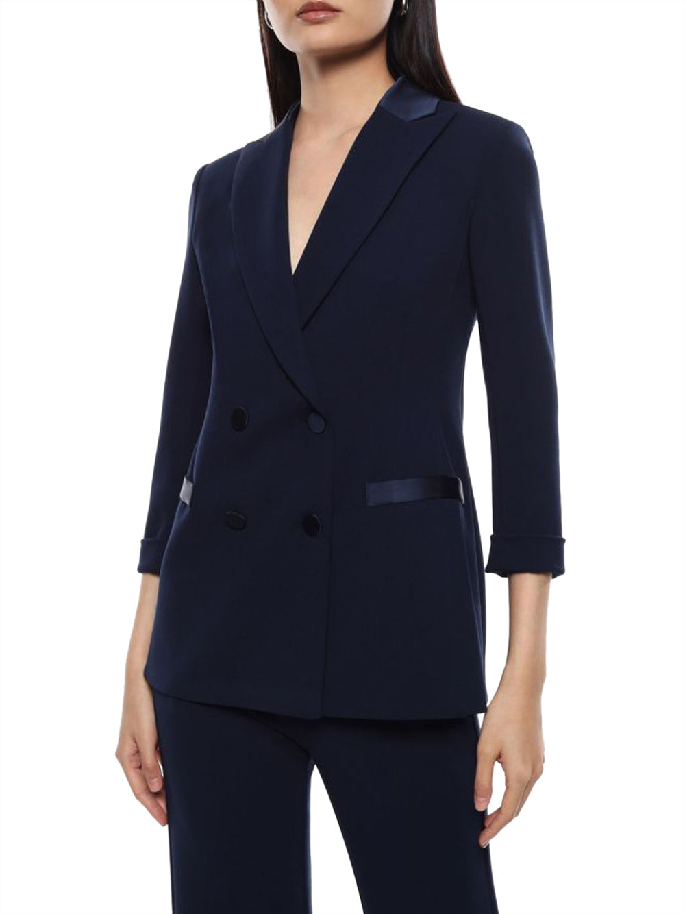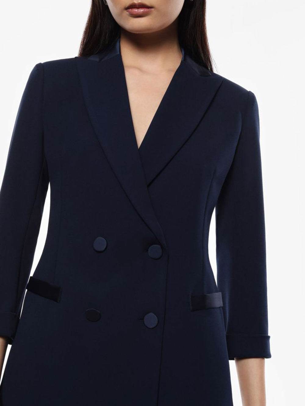 Dettagli: Manica a 3/4, revers a punta in raso, chiusura a doppio petto con bottoni in raso