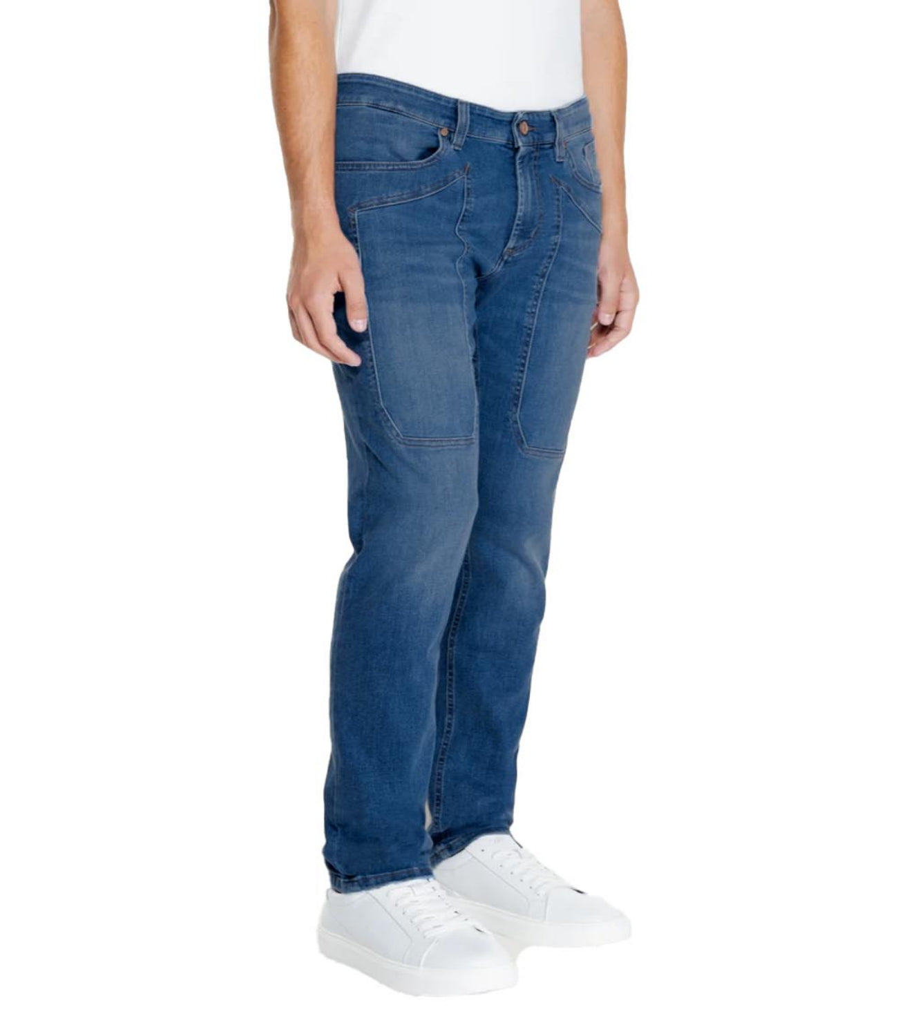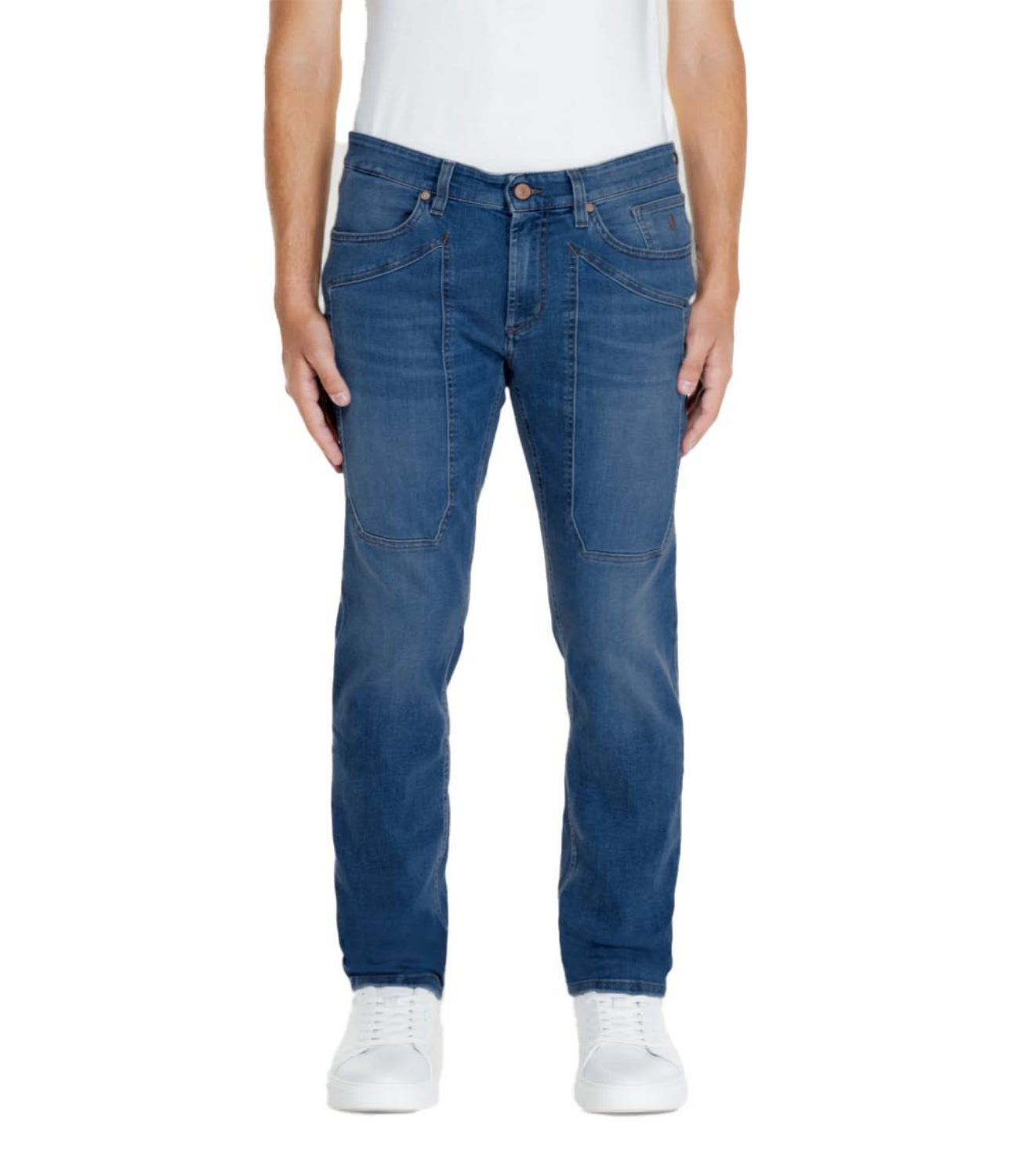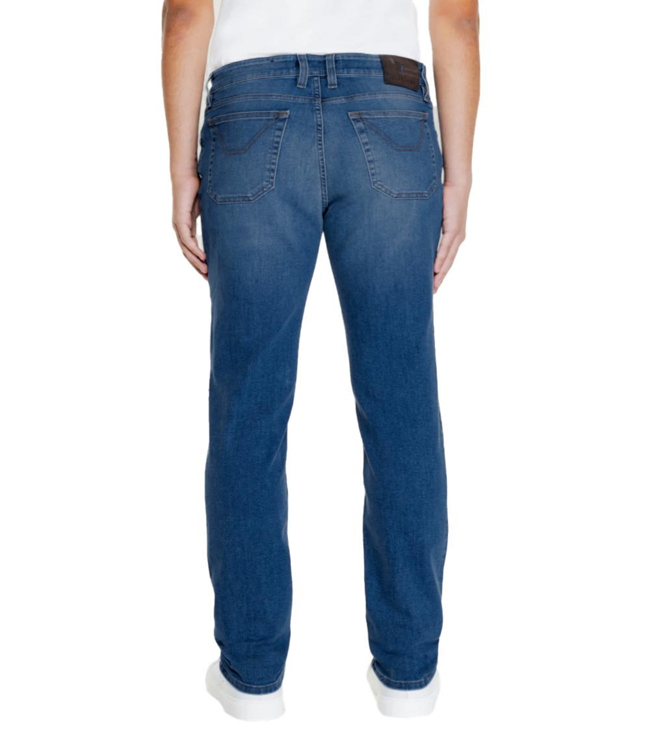 Pantalone 5 tasche con toppa slim fit realizzato in denim ecologico blu scuro. Il capo è caratterizzato da salpa retrocinta in cuoio rigenerato, cintura interna che riporta il nome e il fit del modello ricamati in tono con le cuciture e logo J ricamato sul taschino sinistro.