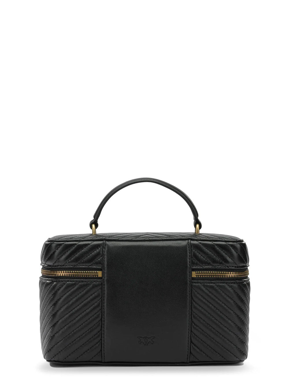 Un accessorio che coniuga perfettamente l'estetica iconica di Pinko con la massima funzionalità. Questo beauty case, realizzato in pregiata pelle nera, si distingue per la raffinata lavorazione trapuntata a chevron che dona volume e un tocco di eleganza senza tempo. Il design strutturato è impreziosito dal logo metallico Love Birds Diamond Cut sul davanti, simbolo inconfondibile del brand. La pratica chiusura con zip a doppio cursore facilita l'accesso all'ampio scomparto interno, mentre il manico on-top e la tracolla in pelle rimovibile offrono diverse opzioni di trasporto. Ideale per organizzare i propri essenziali con stile, sia in viaggio che come sofisticata borsa a mano per un look city-chic.