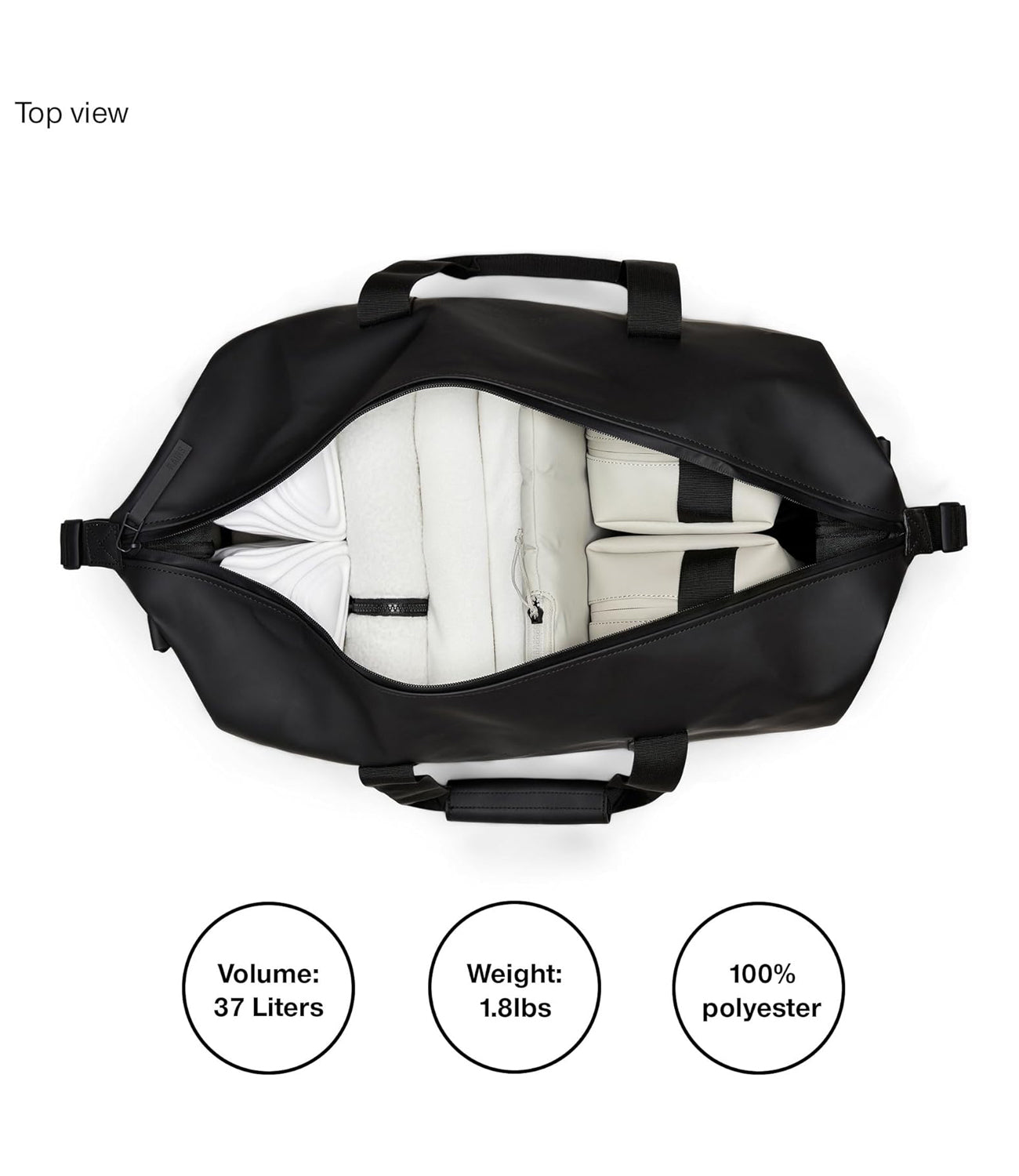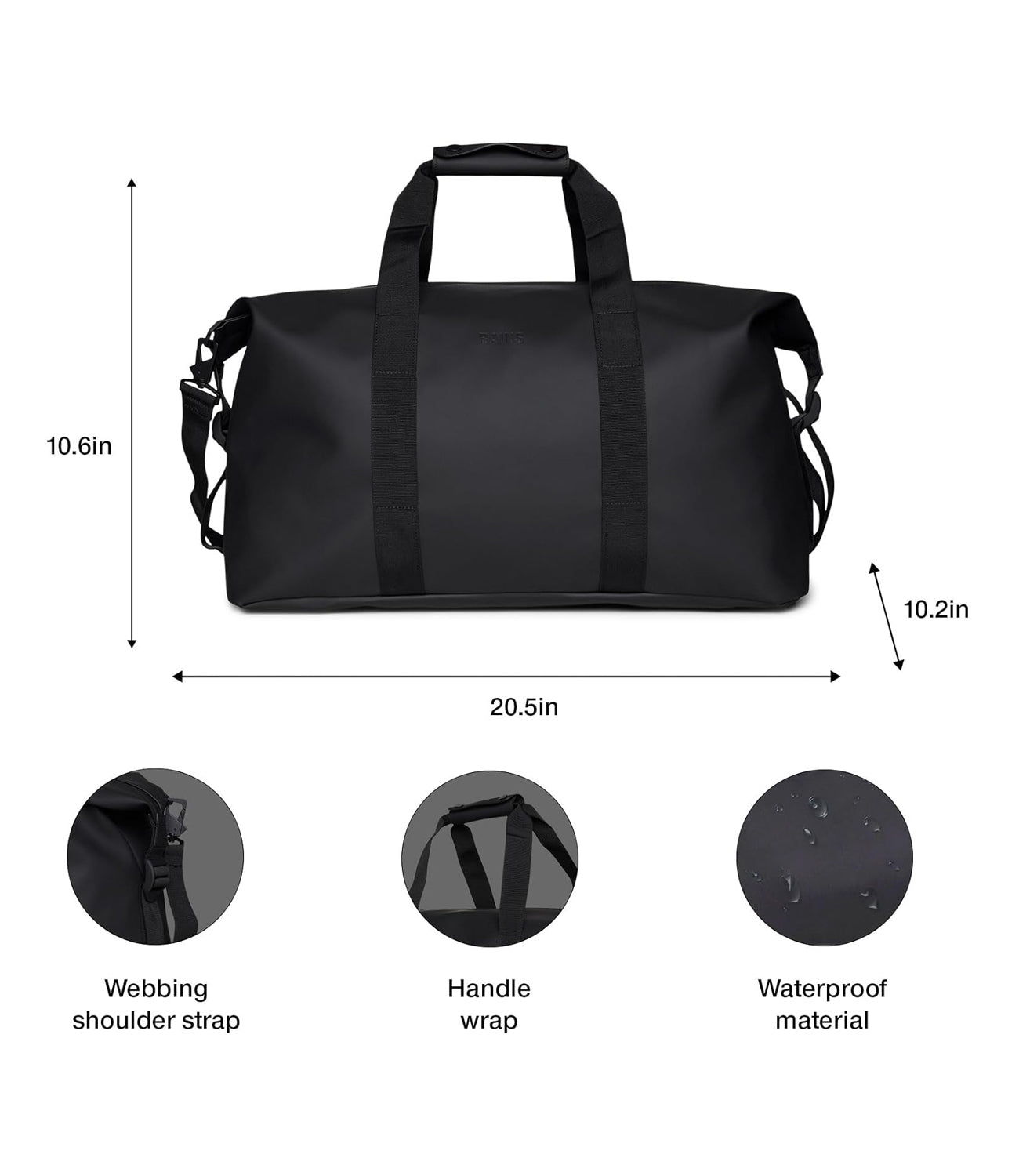 Dettagli: Hilo Weekend Bag: Il Borsone Perfetto per i Viaggi Brevi La Hilo Weekend Bag è la reinterpretazione di Rains del borsone da viaggio, un accessorio essenziale e contemporaneo pensato per i tuoi viaggi brevi. Il suo design unisce l'iconico tessuto impermeabile in PU del brand a dettagli funzionali, rendendola robusta, resistente e piacevole al tatto. Apri la zip rivestita a tutta lunghezza per accedere a un ampio scomparto singolo, ideale per sistemare abiti, dispositivi e altri effetti personali. Le cinghie di compressione laterali ti permettono di compattare la borsa e tenere tutto al sicuro. Il borsone è dotato di manici in tessuto con custodia comfort e anelli per fissare la tracolla rimovibile inclusa. Un compagno di viaggio versatile, perfetto sia per un weekend fuori porta che per un viaggio di lavoro. Borsone per viaggi brevi in PU impermeabile. Chiusura: zip rivestita a tutta lunghezza. Dettagli: scomparto singolo, cinghie di compressione laterali, manici di trasporto e tracolla rimovibile. Dimensioni: 27 x 26 x 52 cm Capacità: 36 litri Composizione: 100% PES (Poliestere)