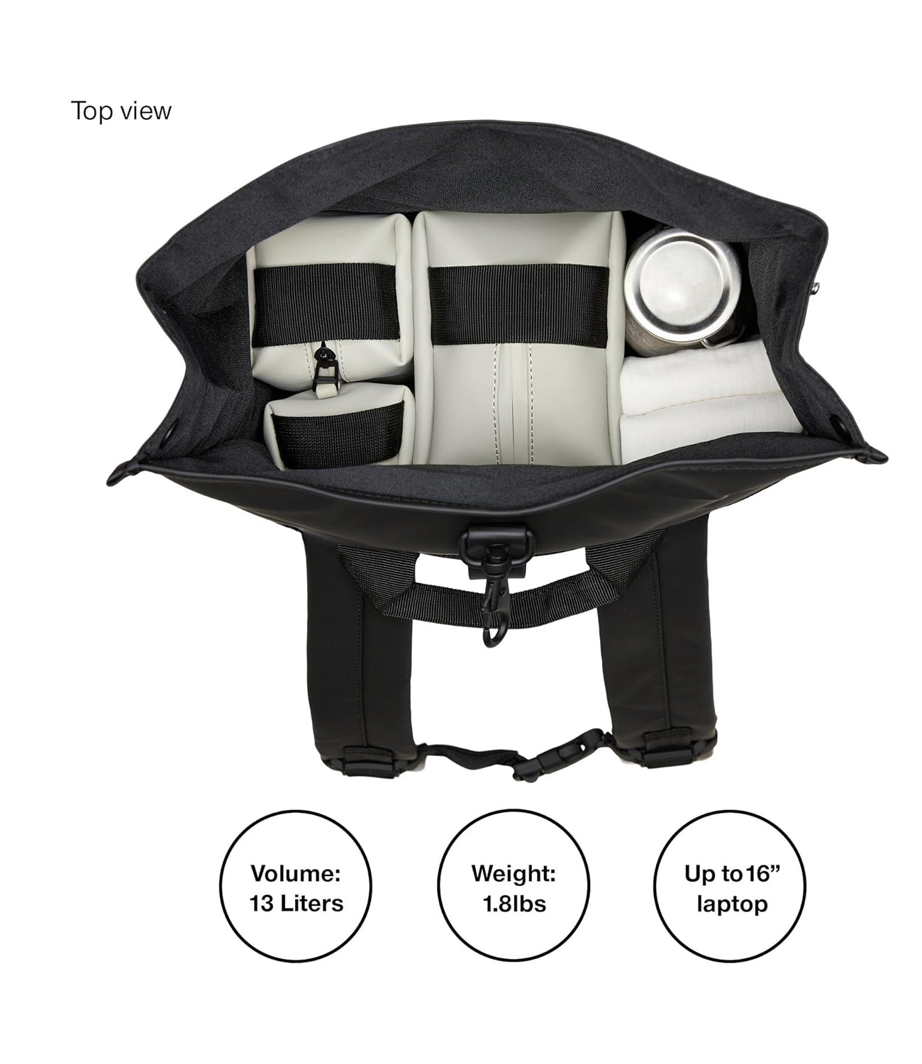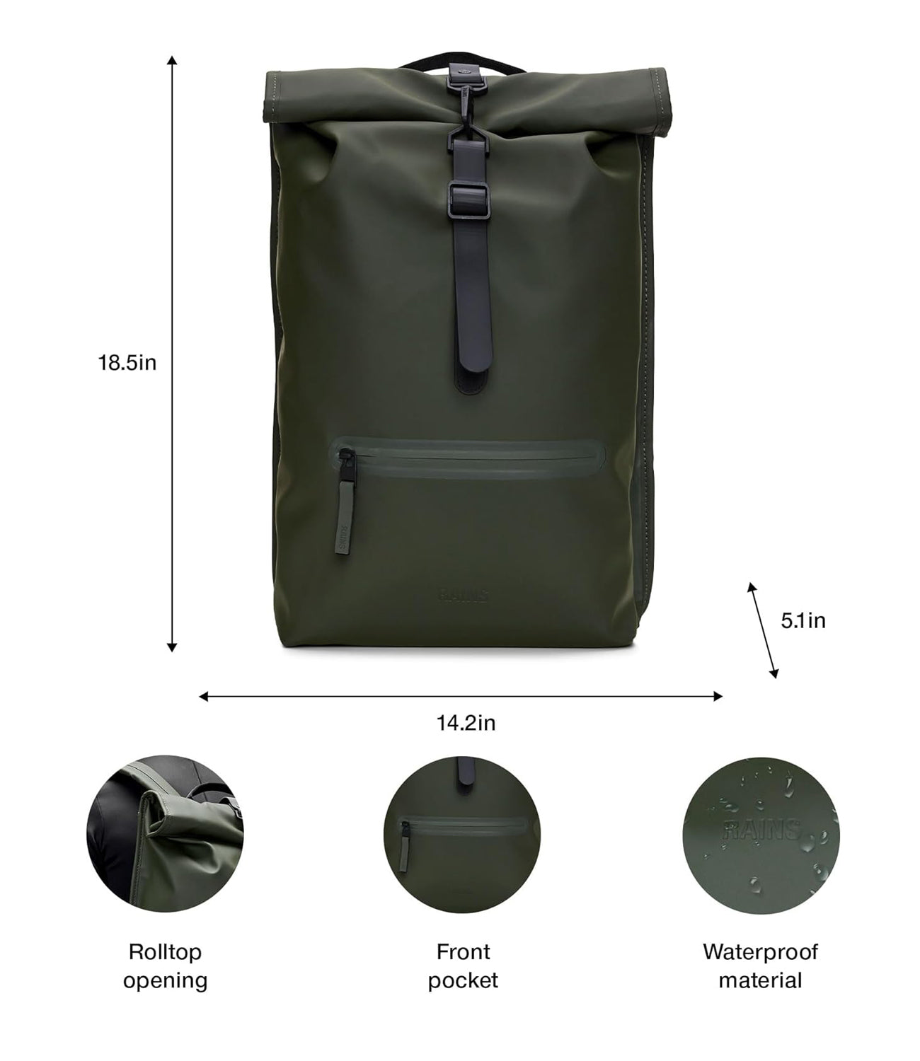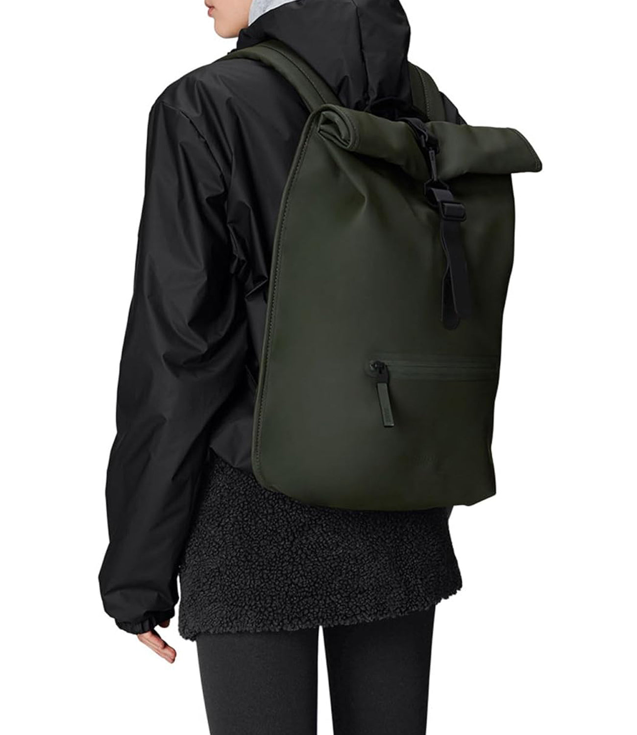 Dettagli: Il Rolltop Rucksack è perfetto per la città e per gli spostamenti a piedi o in bicicletta. Caratterizzato da apertura rolltop e funzionalità pensate per i ciclisti. Il Rolltop Rucksack è progettato con cura per bloccare la pioggia durante gli spostamenti all'aperto. Per proteggere gli oggetti essenziali dalla pioggia, la parte superiore si arrotola e si fissa con l'iconico moschettone. L'apertura dello zaino rivela un ampio scomparto principale. Le caratteristiche esterne includono una tasca per laptop con accesso laterale e una tasca frontale con cerniera rivestita. Le caratteristiche pensate per i ciclisti includono un anello a D anteriore, ideale per tenere i lucchetti della bici, e una cinghia pettorale con fibbia, per una vestibilità sicura a prova di pedalata. Il Rolltop Rucksack è realizzato nell'iconico tessuto PU di Rains, progettato per essere robusto, duraturo e piacevole al tatto. Composizione: 100% poliestere Misure: Alt. 48 x Lungh. 32 x Largh. 11 cm
