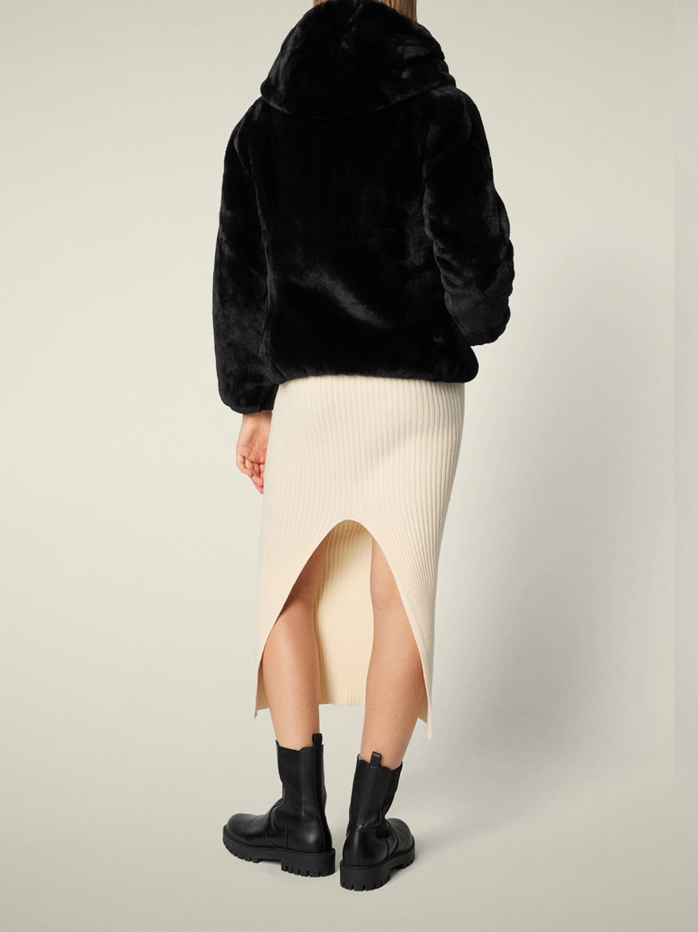 Lato Eco-Pelliccia: Soffice e calda pelliccia sintetica effetto agnellato (fury) in poliestere riciclato, per un tocco di stile audace.