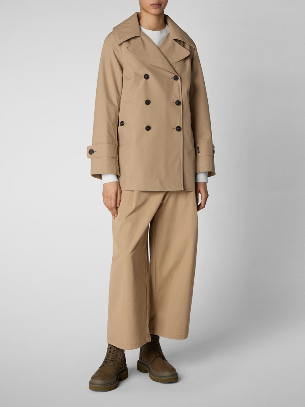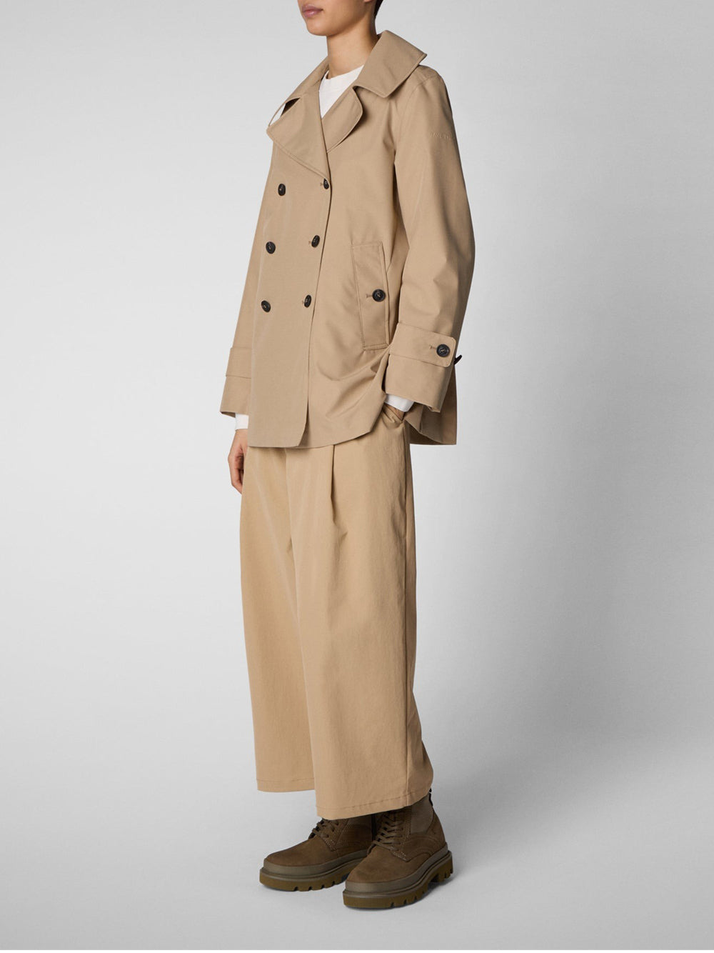 Si tratta di un trench che rivisita il modello classico all'inglese con un taglio corto e ampio. È realizzato in tessuto tecnico con cuciture nastrate, ed è dotato di chiusura a doppio petto, ampi revers e martingala sul retro. I cinturini regolabili ai polsi e i bottoni personalizzati con finitura gommata aggiungono un tocco di stile distintivo, completato dal logo del brand applicato sulla manica.