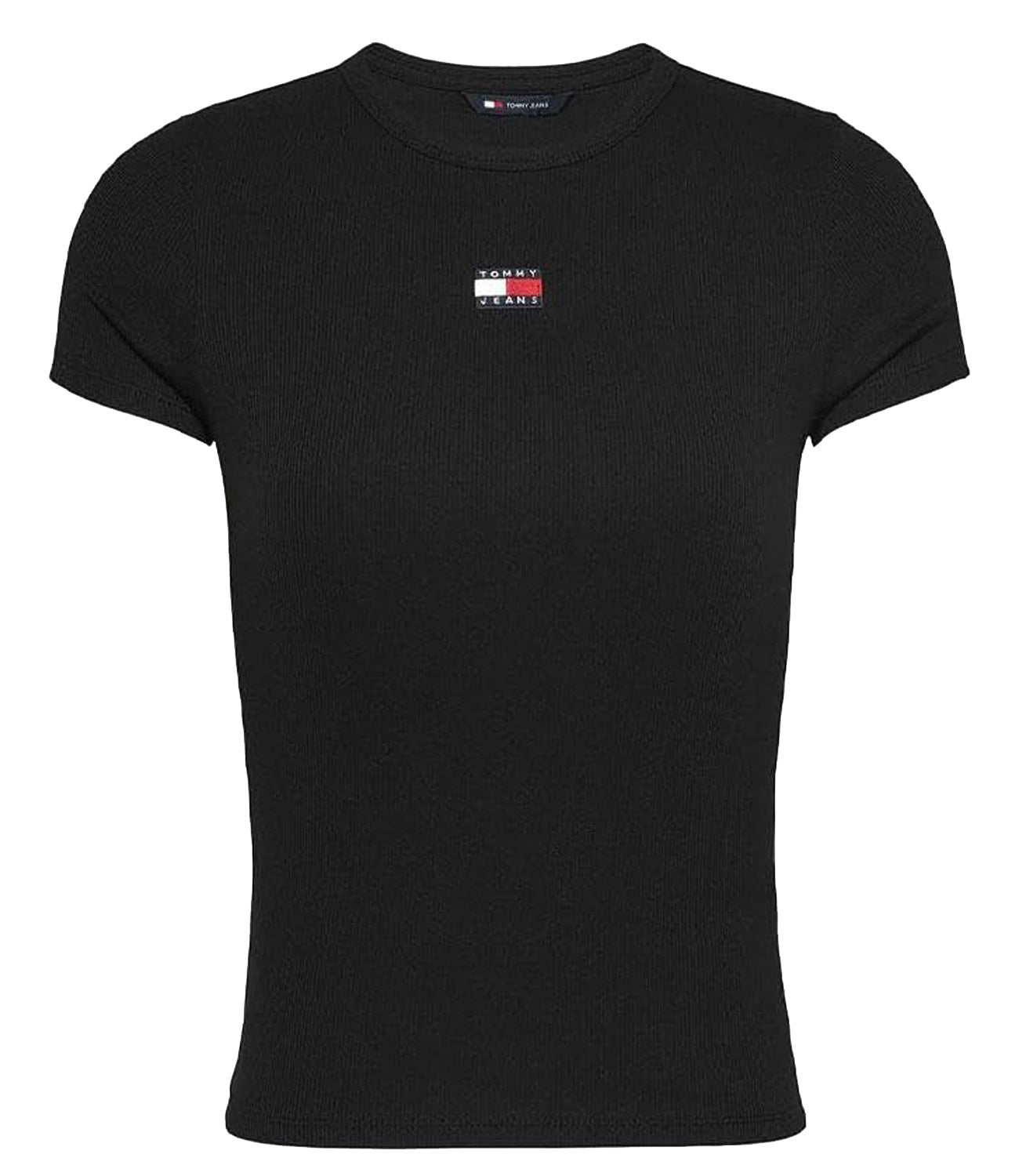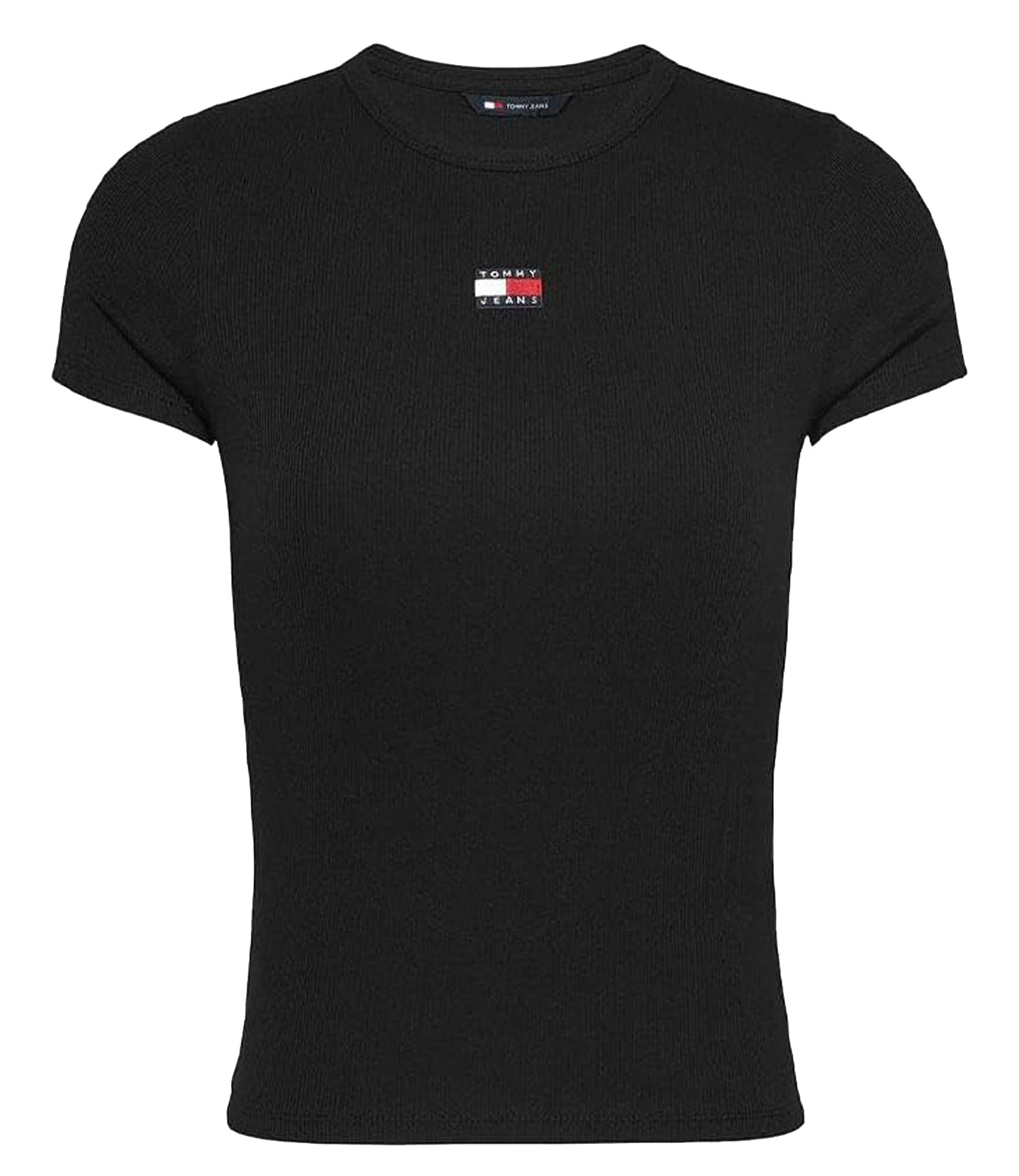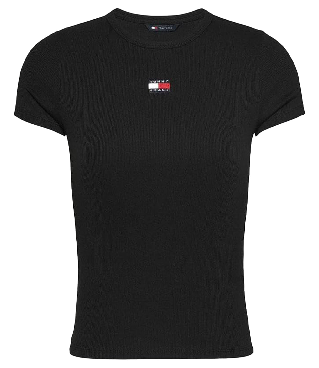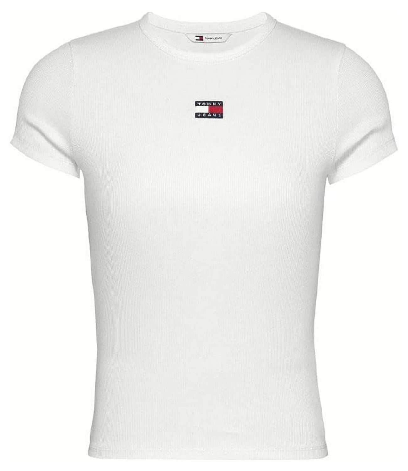 T-Shirt Tommy Jeans. Questa maglietta è realizzata in cotone stretch con una texture a coste, offrendo una vestibilità aderente che esalta la silhouette. Presenta un girocollo e un distintivo Tommy ricamato sul petto, aggiungendo un tocco distintivo al design. La composizione è 95% cotone e 5% elastan, garantendo comfort e flessibilità. Caratteristiche principali: Materiale: 95% cotone, 5% elastan. Design: Texture a coste, girocollo, distintivo Tommy ricamato sul petto. Vestibilità: Slim fit.