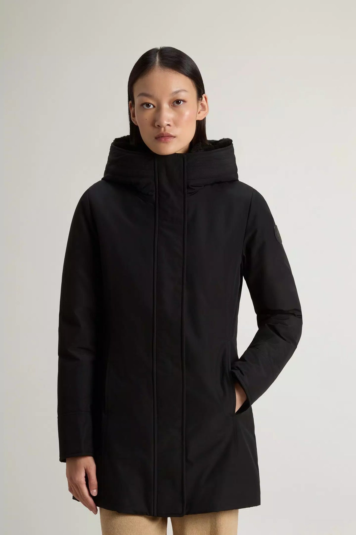 Dettagli: Cappuccio con inserto staccabile in pelliccia sintetica, Chiusura con zip e bottoni nascosta, Tasche a filetto con bottoni a pressione, Polsini interni a costine, Badge con logo sulla manica sinistra